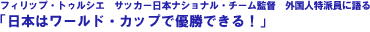 でも、そうは言っても、フィリップ・トゥルシエは違いに敏感ですし、また、日本人の生活に敏感ですから、日本人の原則やコミュニケーションの方法や振る舞いのいくつかを受け入れました。しかし、私の仕事の部分では、完全には理解されない部分がありました。私たちにはあまり時間がなかったのです。ナショナルチームの監督にはいつも時間がありません。日本人の要求は少し大きすぎます。彼等は、私に最高であることとその結果を期待します。最初から、プライオリテを与えることを知るべきです。私のプライオリテはいつも、パフォーマンスの高さであり、能力の高さであり、実りの多さでした。そのような期待の中にいて、その期待に添うために、私はマネージャーであり、コーチであり、私の目的は、選手を選択し、試し、チームを造ることでした。